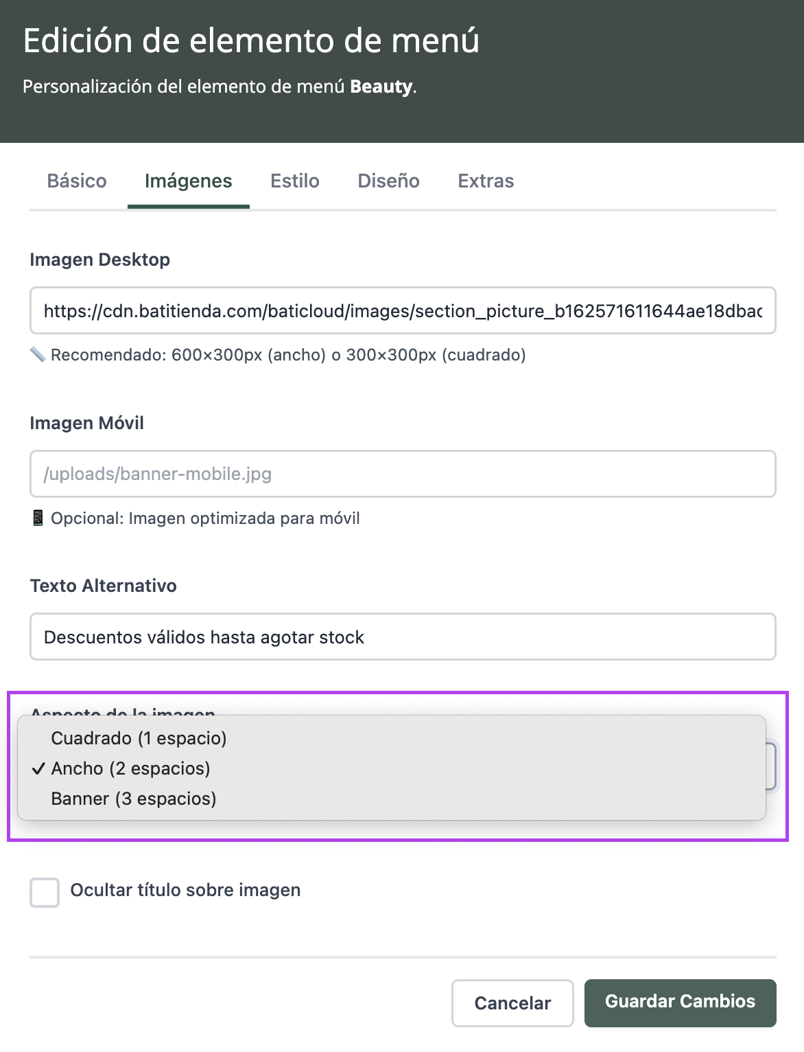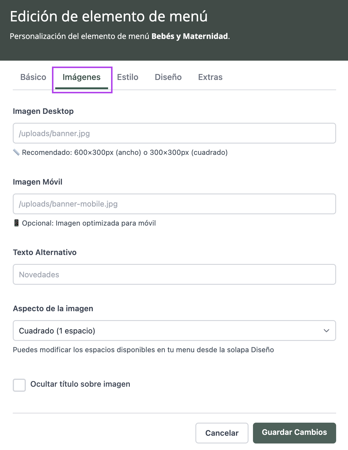 - 💻 Desktop: 600×300 px (recomendado) o 300×300 px (cuadrado).