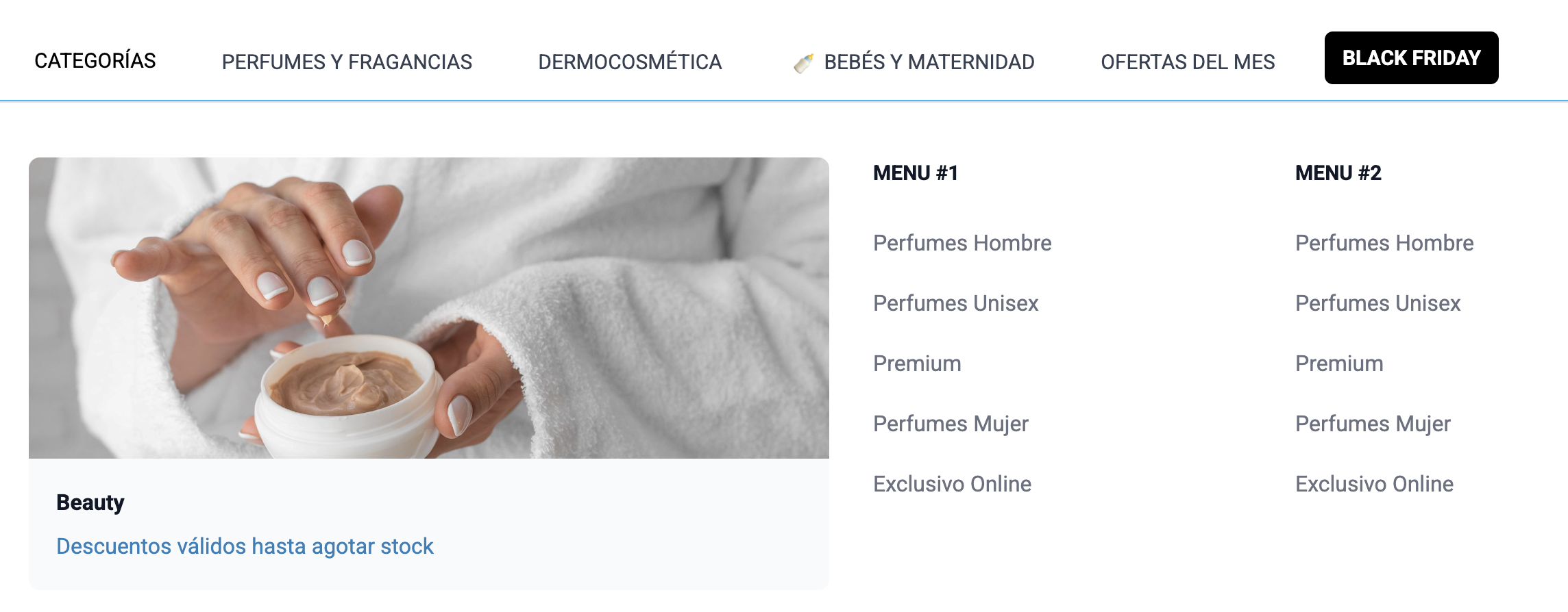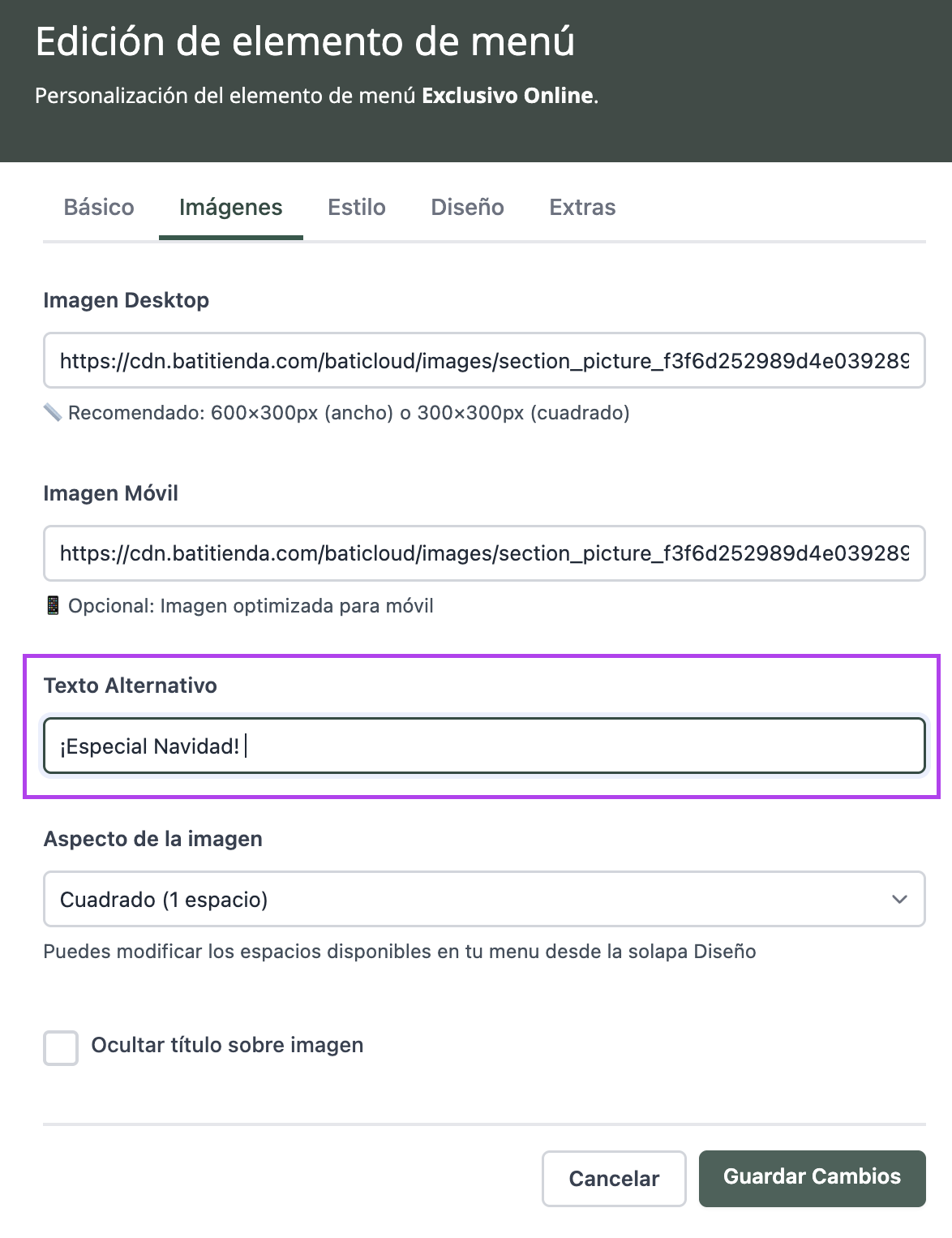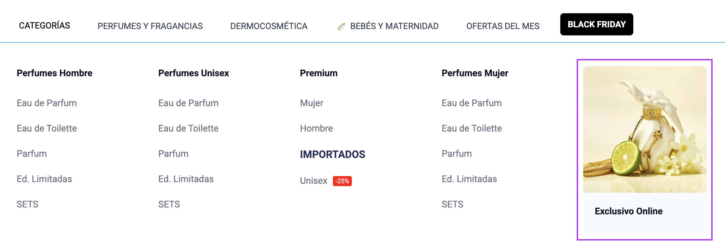 El texto alternativo es útil si querés agregar información adicional sobre ese ítem, por ejemplo: “Exclusivo online”, “Especial día de la madre”.