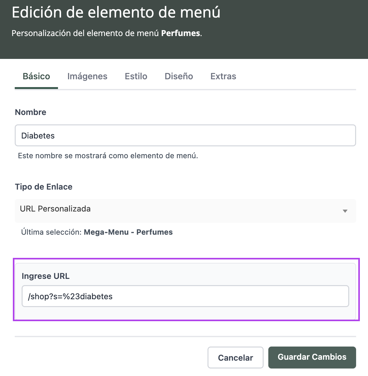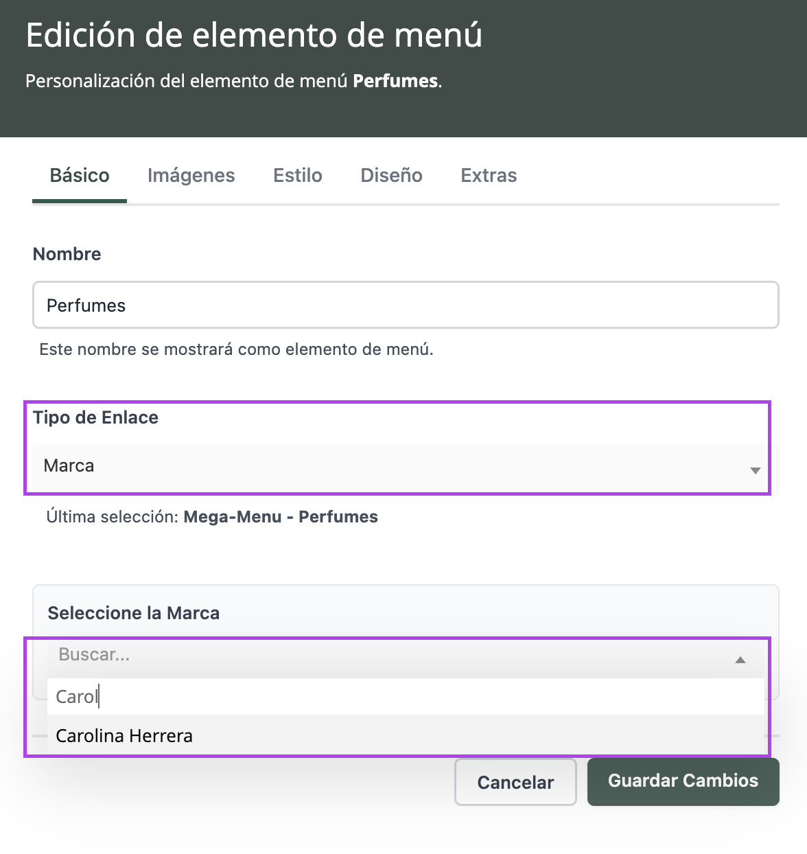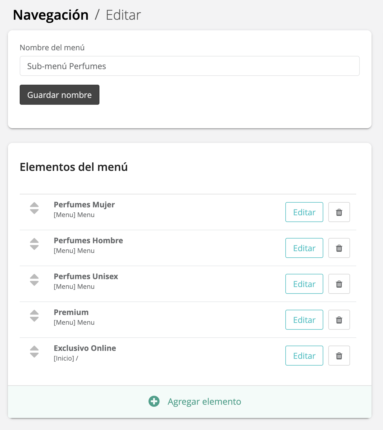 💡 Tip: Si querés mostrar varias marcas, en este caso deberías armar un menú que se llame “Marcas Perfumes” y colocar dentro todas las marcas que quieras.