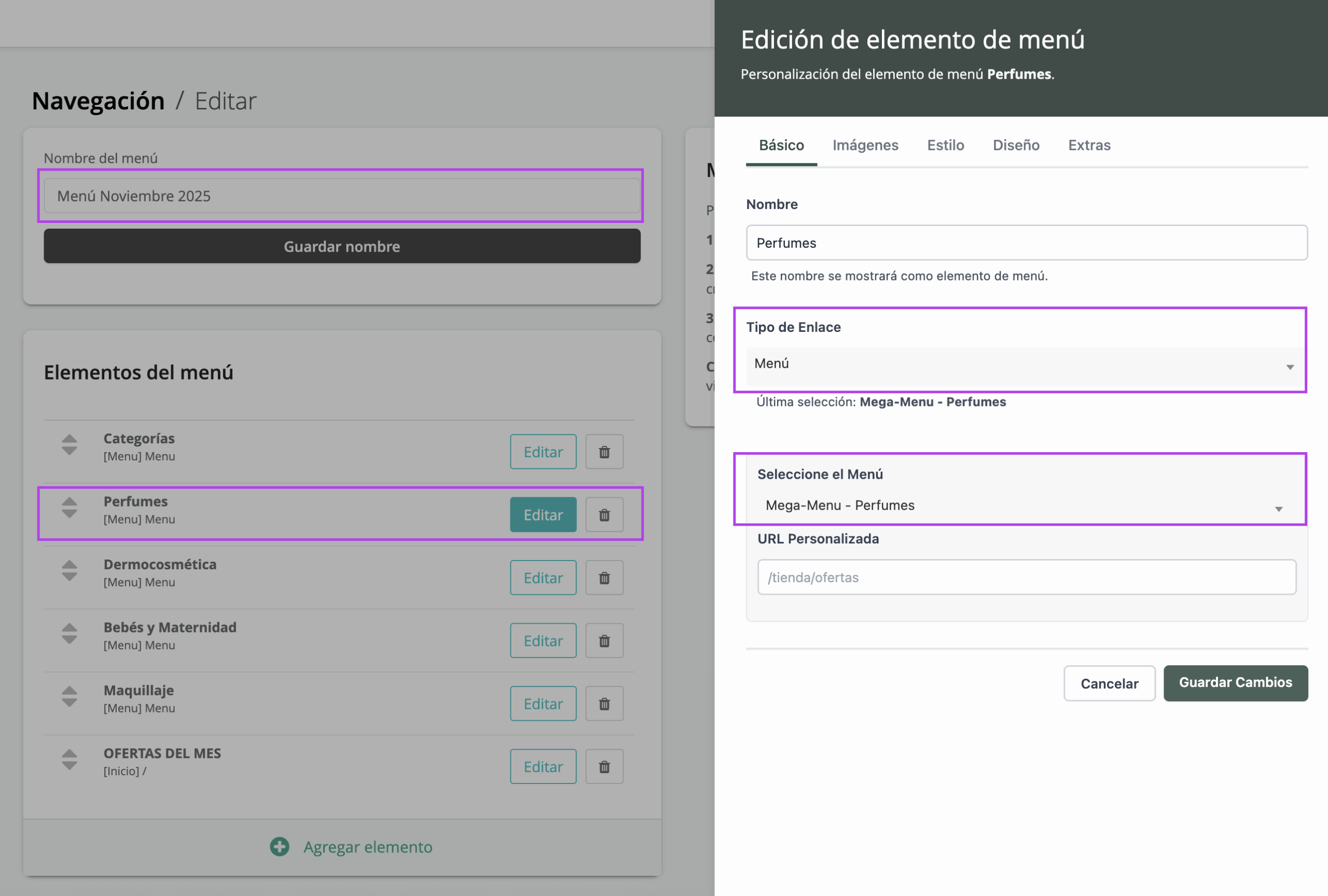 Y lo linkeás al menú principal eligiendo la opción “Menú”, vas a lograr que al pasar el mouse por “Perfumes”, se despliegue automáticamente ese submenú.