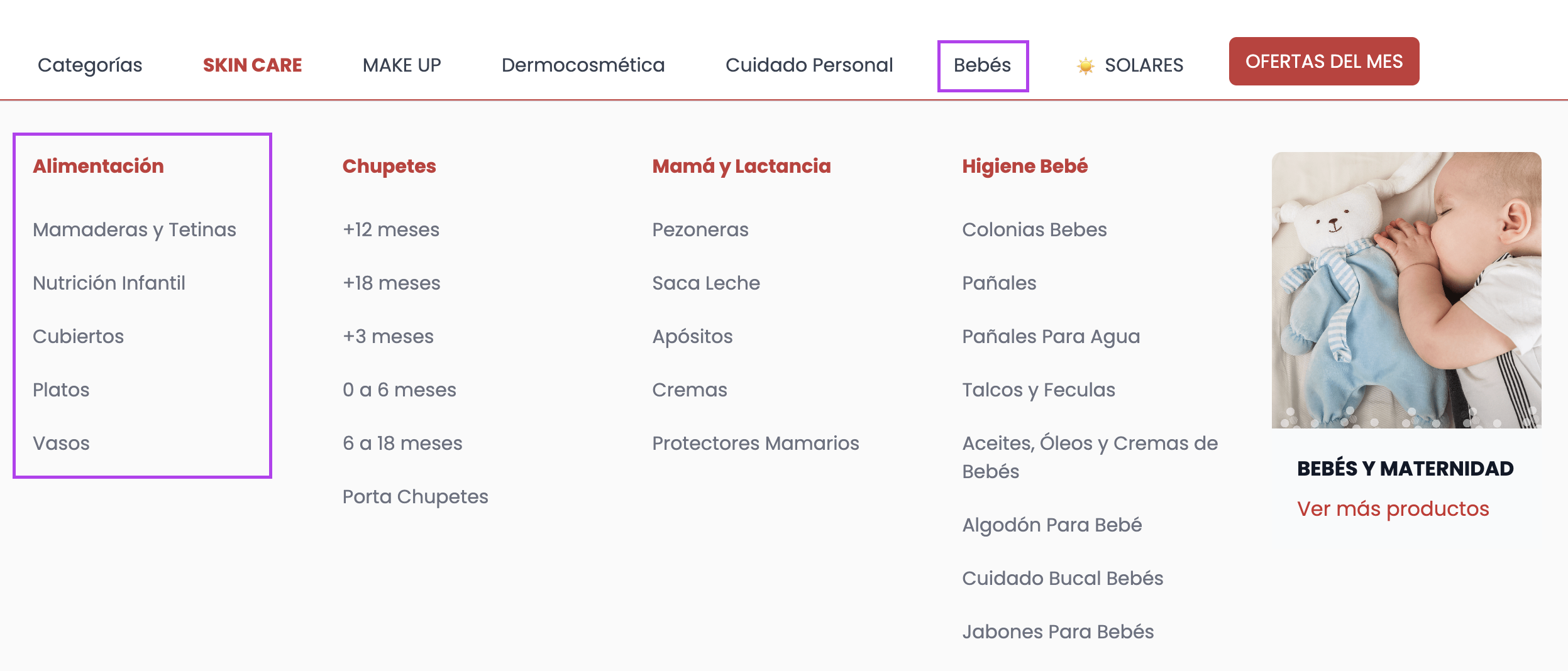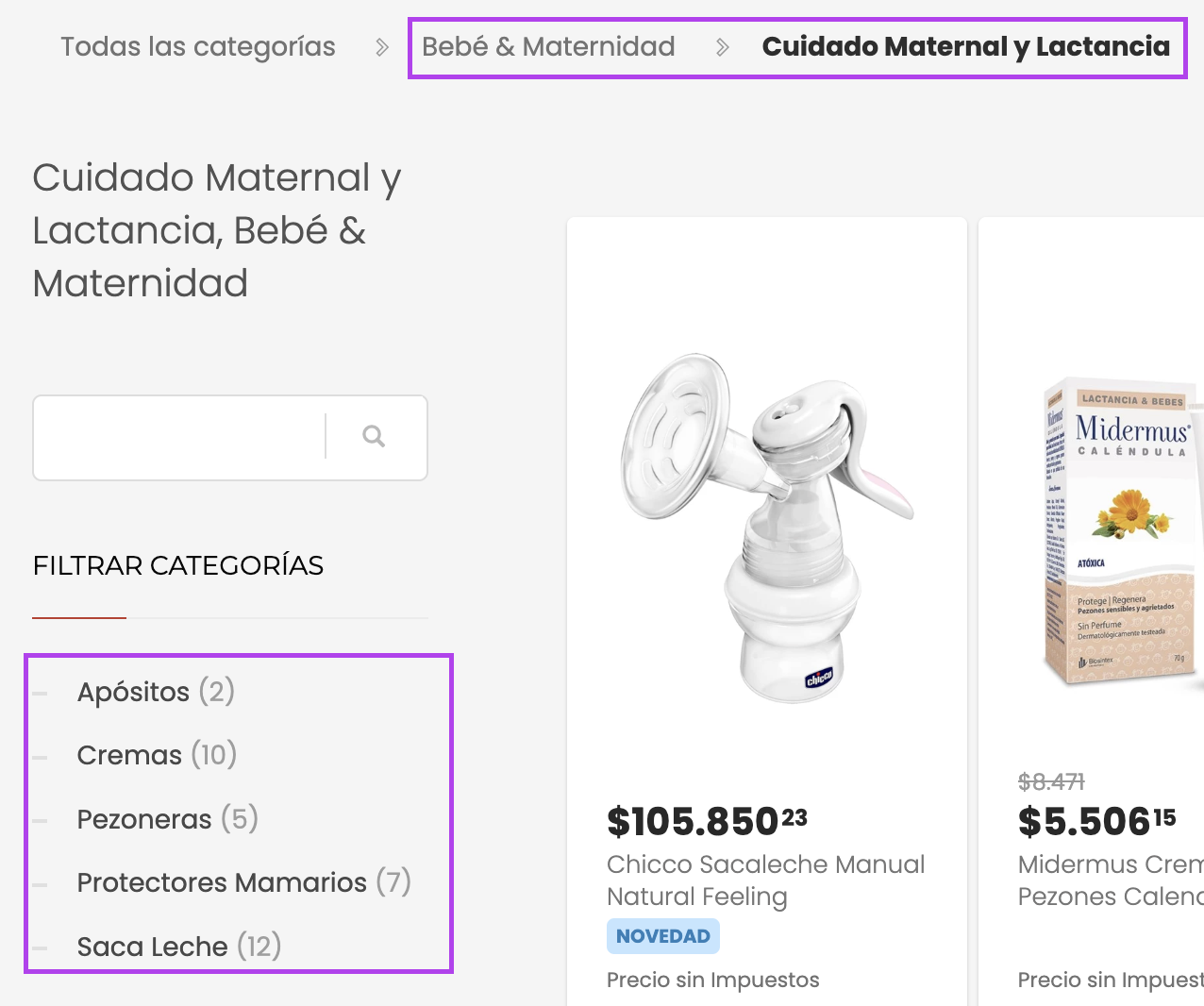 Podés tener “Bebés y Maternidad” como categoría principal, y dentro de ella, “Mamá y Lactancia” como categoría hija, junto con todas las subcategorías que la componen, como: