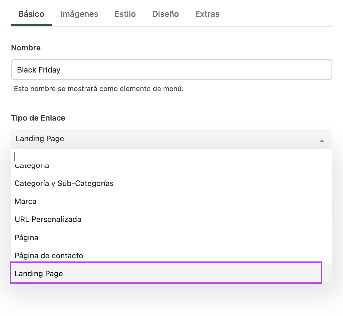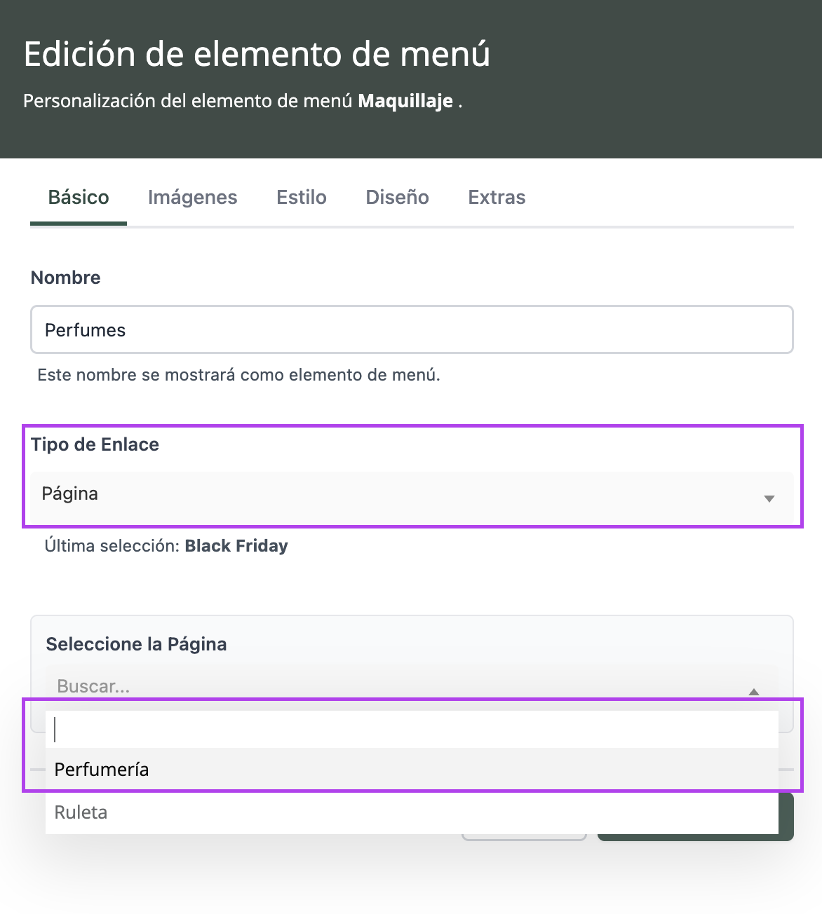 En este caso, la página se llama “Perfumería”, entonces dentro de las opciones de link en el menú vas a elegir “Página” y luego buscar por nombre la página que querés vincular.