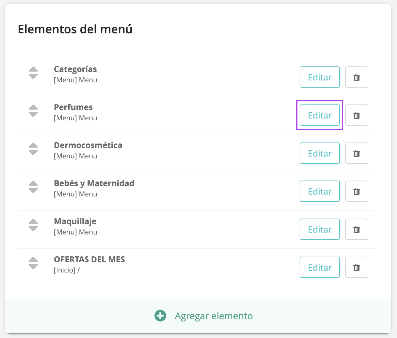 💡 Tip: Si querés mostrar varias marcas, en este caso deberías armar un menú que se llame “Marcas Perfumes” y colocar dentro todas las marcas que quieras.