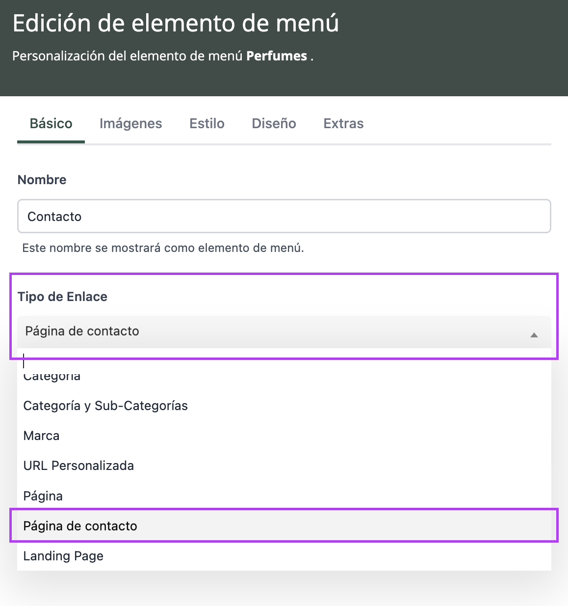En este caso, la página se llama “Perfumería”, entonces dentro de las opciones de link en el menú vas a elegir “Página” y luego buscar por nombre la página que querés vincular.